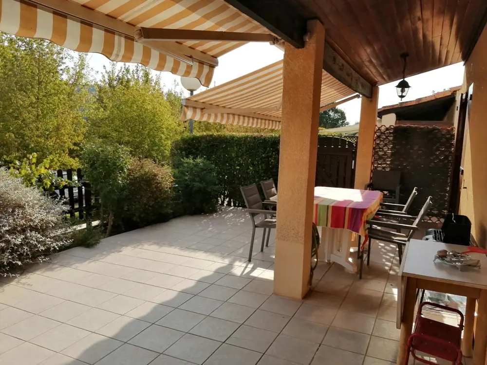 - une grande terrasse clôturée exposée au Sud (34 m2 avec loggia) avec vue sur le tennis, le Colostre et la colline, équipée de mobilier de jardin et d'un barbecue électrique