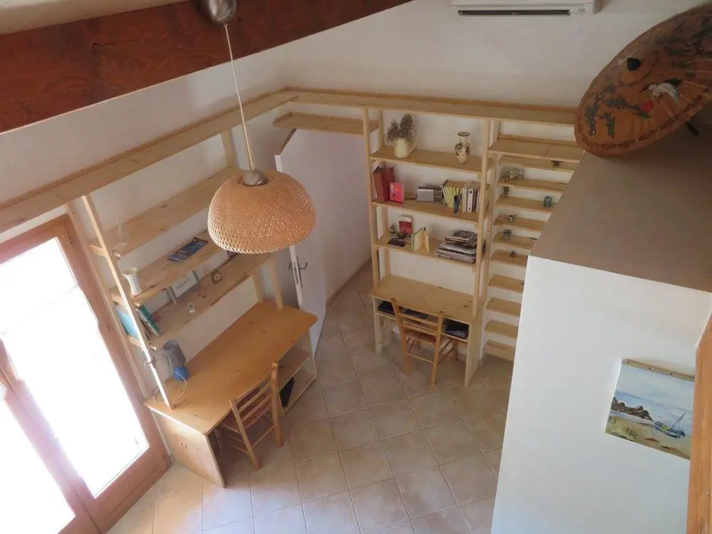 - un séjour de 20 m2 avec cuisine complètement équipée, salle à manger, coin salon, WC, et 1 mezzanine de 8 m2 (1 lit de 2 personnes, armoire et penderie)